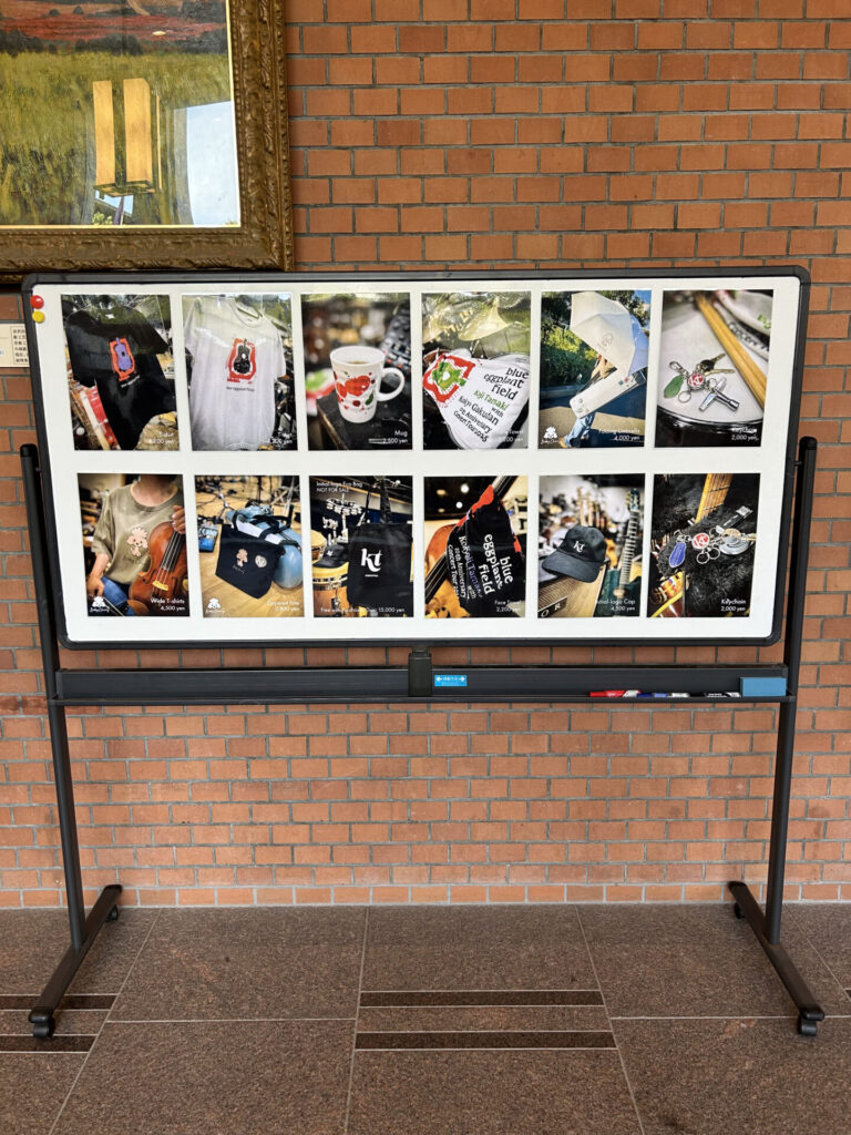 開演前、席に着くと、まず中央のテーブルに置かれたドリンクを確認しました。客席から見て左から、飲み手に蓋が付いたマグカップが2つ、黄色く濁ったペットボトル飲料が1本、透明の水が2本。蓋付きのカップは保温性があるタイプのものでしょうか。