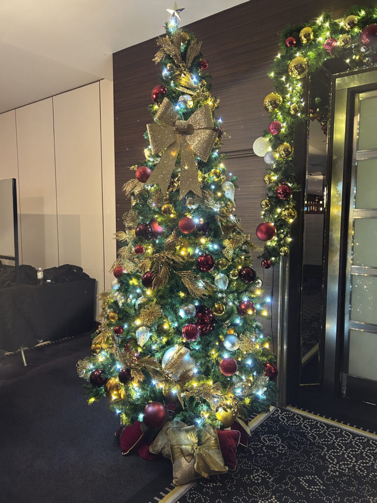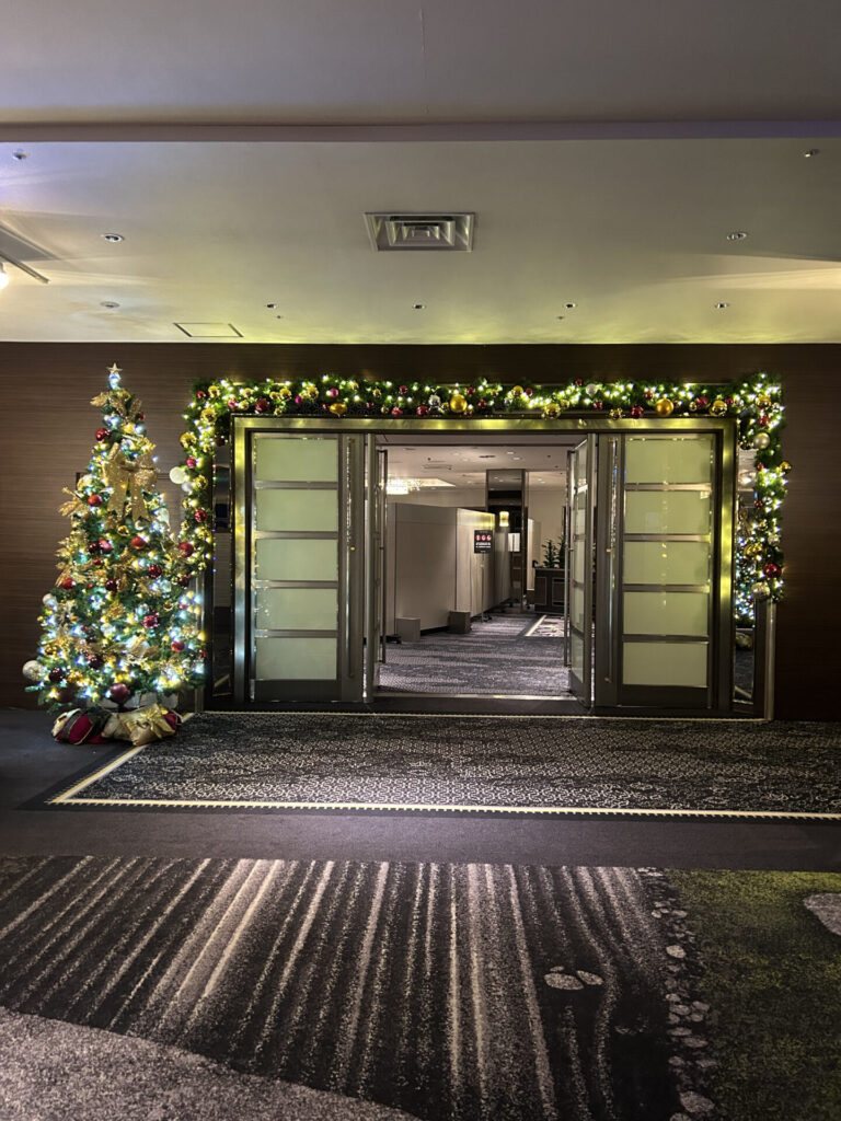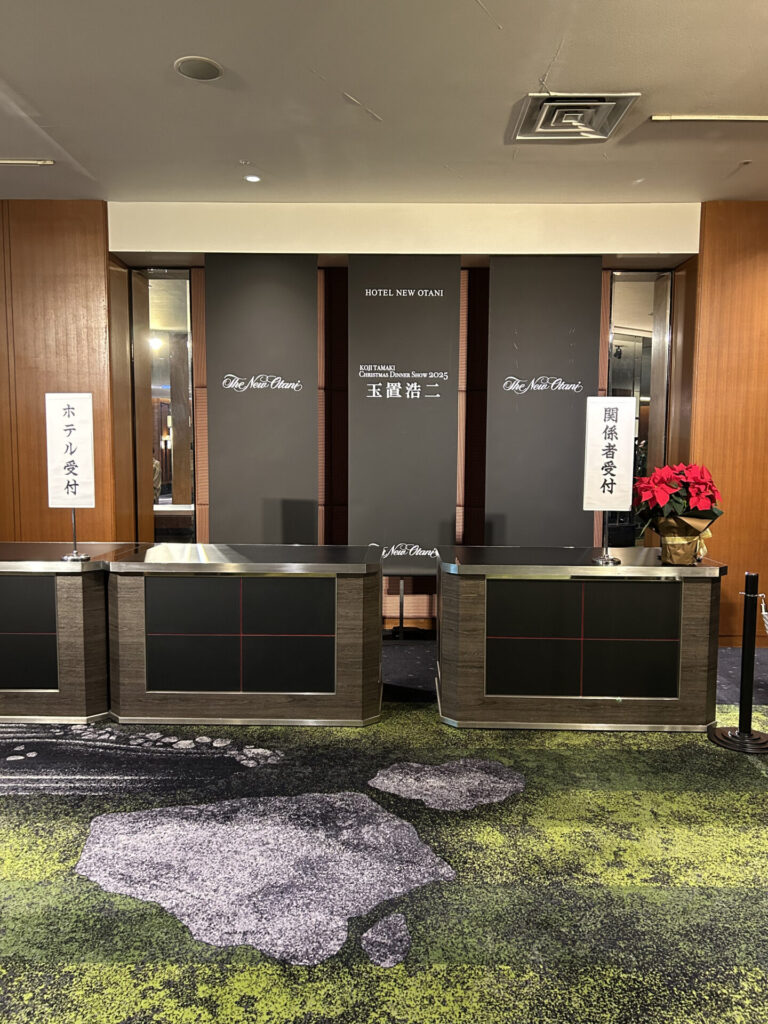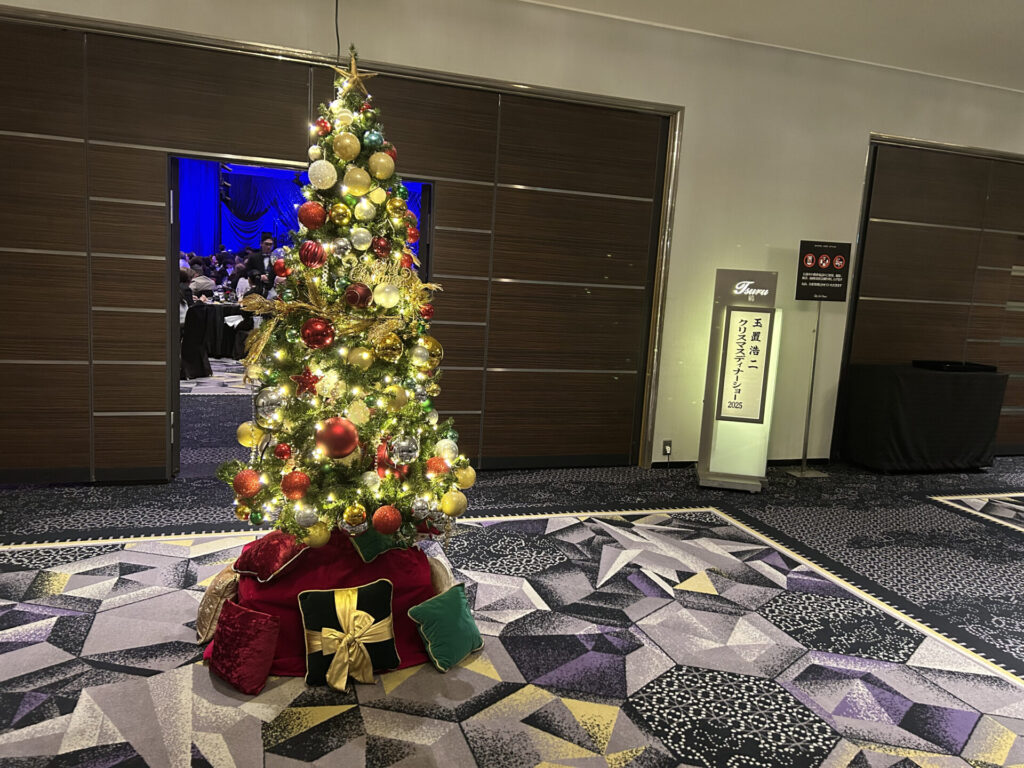 受付を抜けると、日本コロムビア社から寄贈されたフラワースタンドや煌びやかな装飾が施されたクリスマスツリー、そして撮影スポットとして多くの人で賑わった記念ボードを経て、ディナー&ショーが行われる宴会場に辿り着きます。