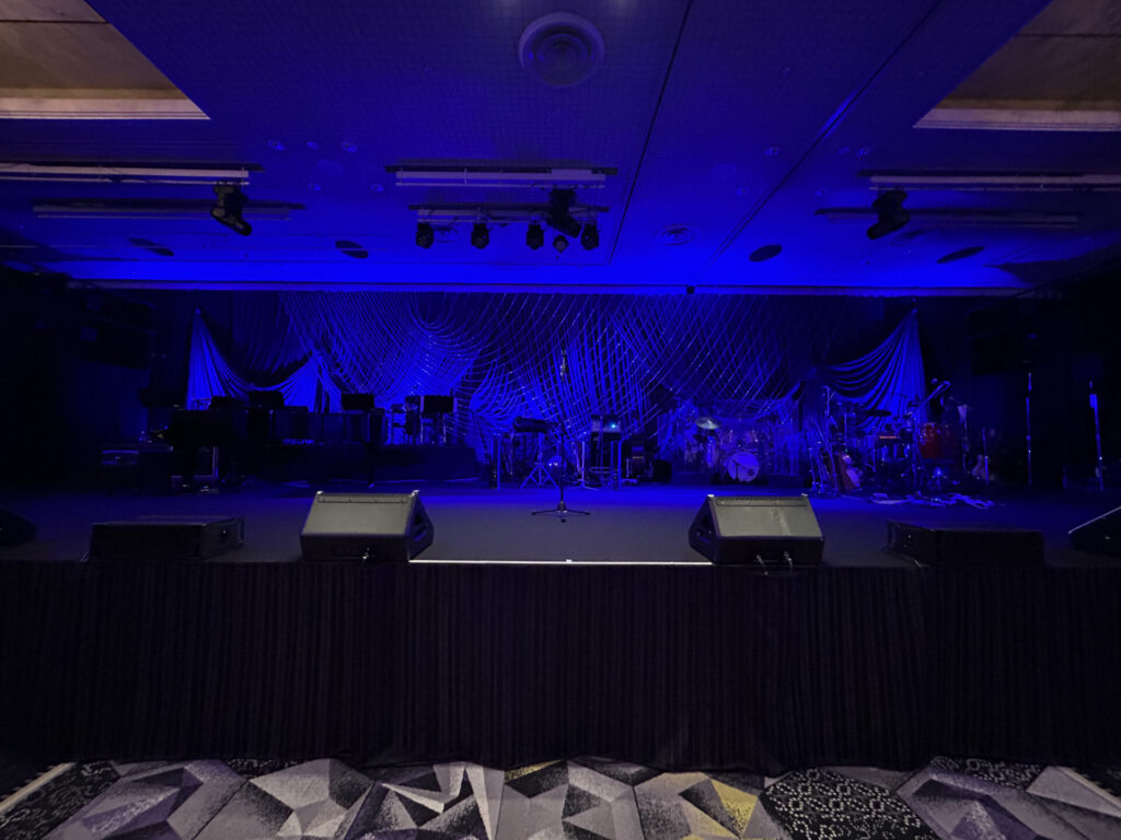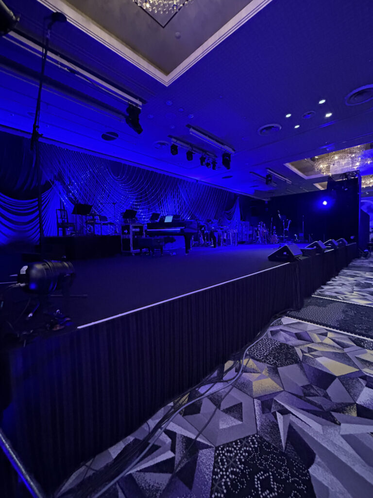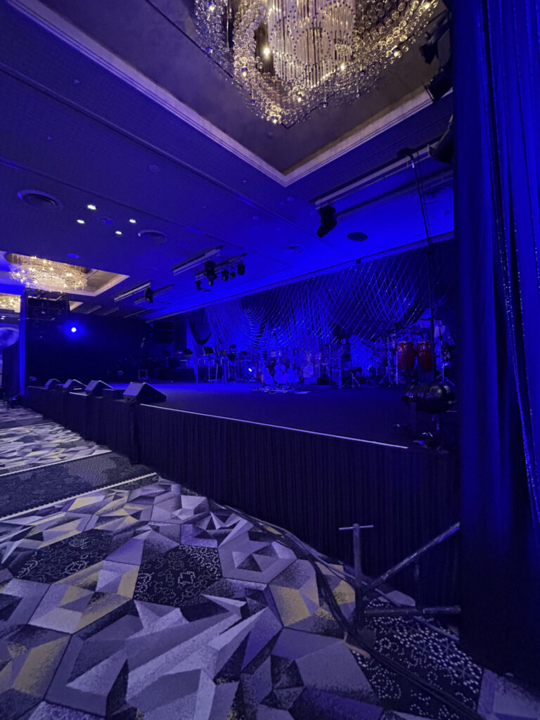 定刻の19時30分、宴会場が暗転してショーが始まります。ドラムの松原さんを先頭にサポートメンバーが下手から入場。全員が黒をベースにした硬い装いは、統一感を感じるとともにフォーマルさが際立っていました。