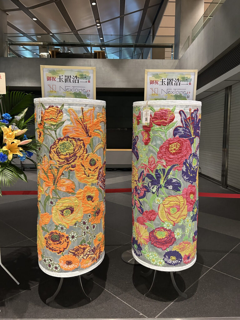 さすがは大ホールでの公演。充実したフラワースタンドの数々が会場を彩ります。その中でも、Nextone社から寄贈された祝い花が一風変わったスタイルでした。スタンドに結ばれたQRコードを読み取ると、同社のブランドであるBLONIAのページにアクセスしました。
