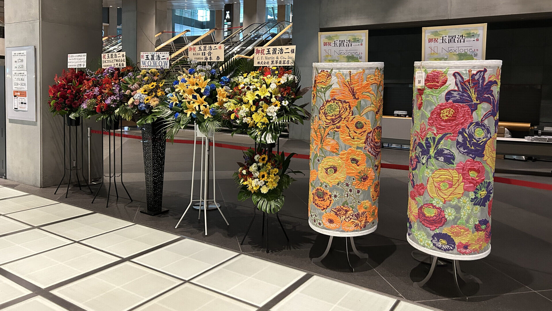 さすがは大ホールでの公演。充実したフラワースタンドの数々が会場を彩ります。その中でも、Nextone社から寄贈された祝い花が一風変わったスタイルでした。スタンドに結ばれたQRコードを読み取ると、同社のブランドであるBLONIAのページにアクセスしました。